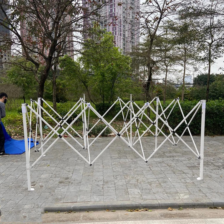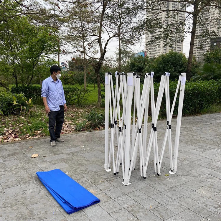 – Chất liệu: khung bằng thép sơn tĩnh điện, mái che vải bạt polyester 800D tráng PVC chống thấm